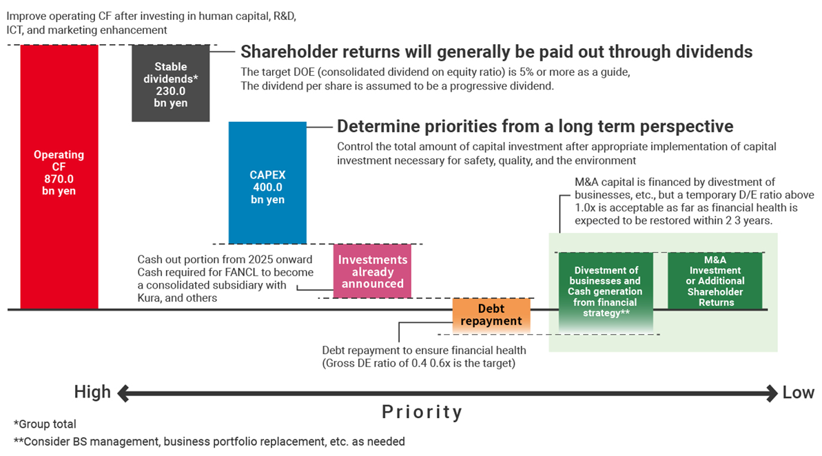 We have set a goal of 870 billion yen in operating cash flow for 2025 to 2027. Since we finally established the foundation for our Health Science Business in FY2024, we will now strive to maximize free cash flow through organic growth of the existing businesses as well as by reducing costs, mainly by eliminating overlapping areas of acquired businesses such as Blackmores and FANCL.