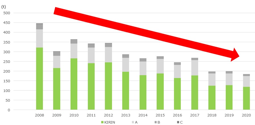 Trends in Japanese Hop Production Volumes by Company *Source: Estimation by Kirin Brewery