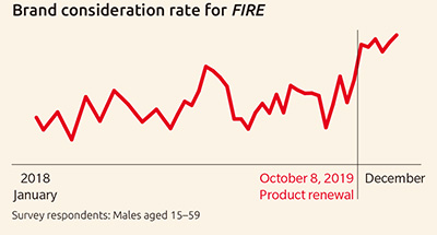 In 2019, we succeeded in increasing the sales volume of the FIRE brand by 4% year on year. Our April 2019 release of FIRE One Day Black, which comes in a PET bottle, contributed to that result. The sales volume of the canned products, which are comparatively more profitable, was down year on year, but we were able to make up for that decrease by streamlining selling expenses, cutting costs, and increasing returns on investment. Consequently, both gross profit and the contribution margin increased year on year. Furthermore, brand recall and brand consideration rates* reached the highest levels in three years, indicating that we had improved brand equity along with the higher profits.