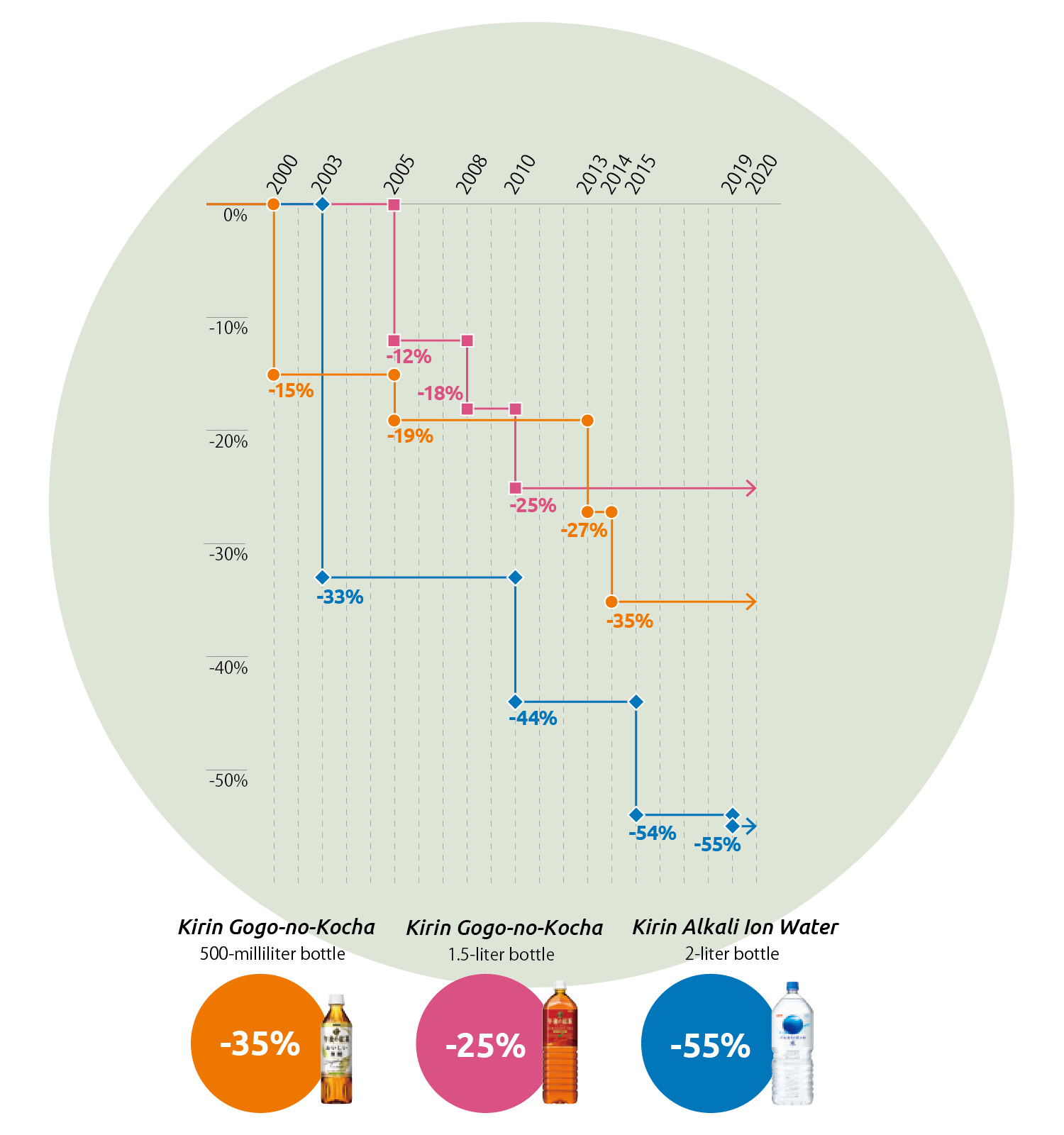In 2015, we developed a two-liter PET bottle weighing only 28.9 grams—the lightest in Japan—and used it for our ionized alkaline water product, Kirin Alkali Ion Water. We reduced the weight again in 2019, making the new bottle 55% lighter than PET bottles of the same size in 2000, which works out to a reduction of about 5,800 tons of PET resin usage per year (worth around 870 million yen). In 2020, we plan to upgrade the 1.5-liter PET bottle used for our tea lineup, Kirin Gogo-no-Kocha, for the first time in a decade, replacing it with a new bottle that is 37% lighter than bottles in 2000. Likewise, the 500-milliliter bottle for the same product will be replaced with a new bottle that is 35% lighter compared with the weight in 2000.