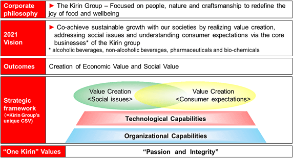 We set the strategic framework, “Kirin Group’s unique CSV (Creating Shared Value)”, to create value that meets customers’ expectations as well as to create value through engagement with social issues, and redefine the 2021 vision and strategic framework.