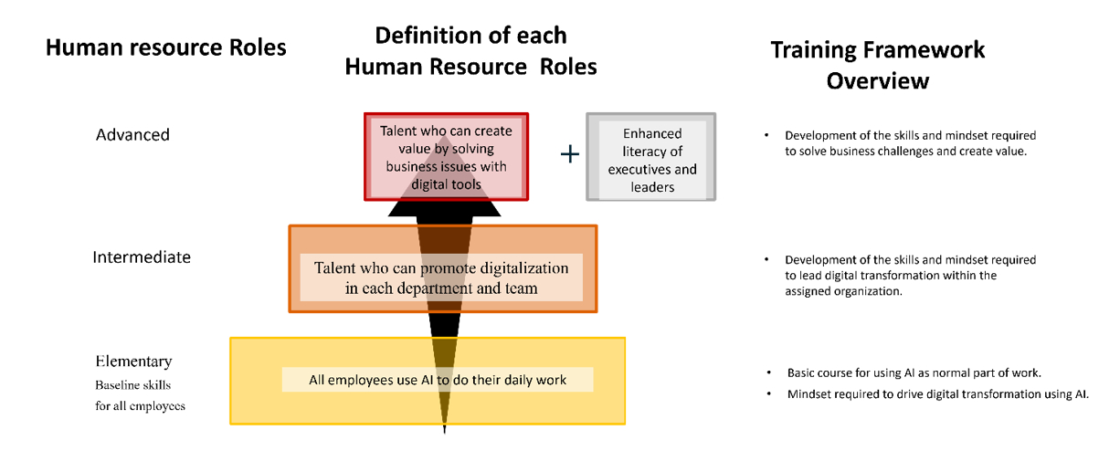 Going forward, we will further enhance the digital skills of our employees as part of our efforts to strengthen our digital infrastructure under the KDV2035. Based on the Digital Skill Standards Ver 1.2*2 defined by the Ministry of Economy, Trade and Industry, the human resource roles required for the Kirin Group are defined as: “Advanced: Talent who can create value by solving business issues with digital tools,” “Intermediate: Talent who can promote digitalization in each department and team” and “Elementary: Talent with baseline skills for all employees.” The training and development system is based on the roles required.