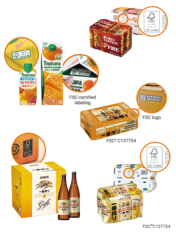 - Achieved 100% usage of FSC-certified paper for paper containers and packaging in Kirin Brewery, Kirin Beverage, and Mercian (2020)