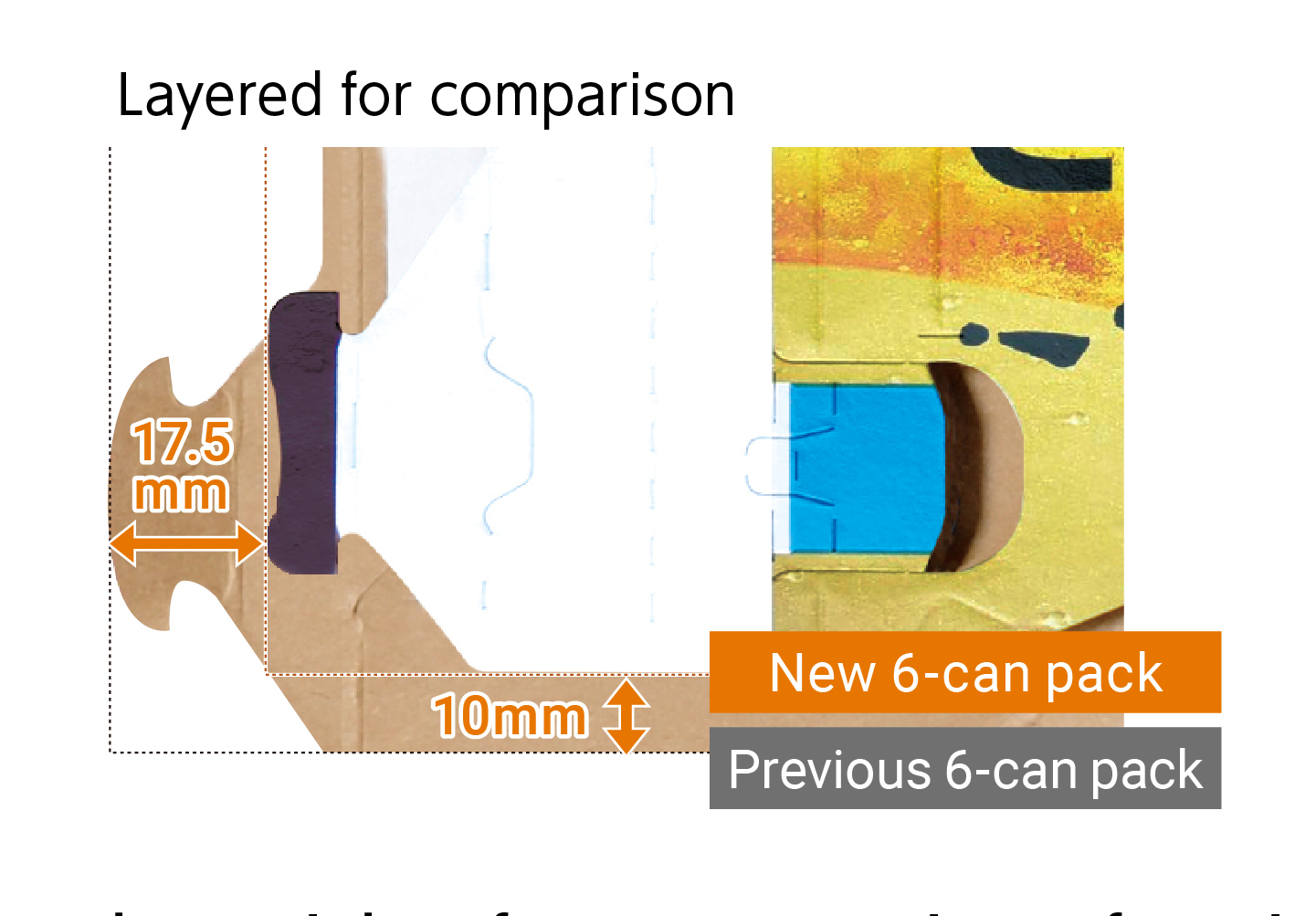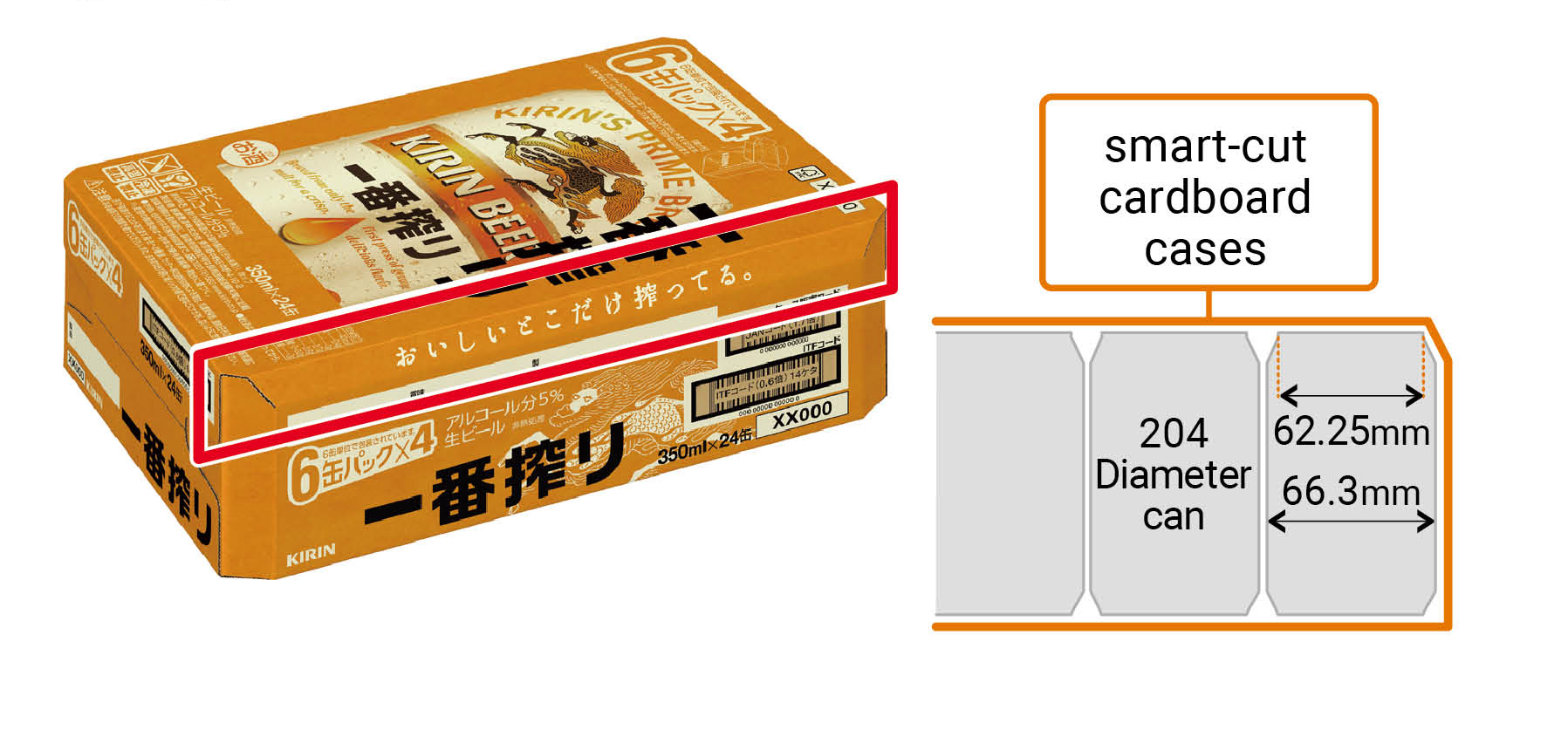 The smart-cut carton is based on the corner-cut carton technology. In addition to the reduction in weight, the corners of the long edges at the top of the carton have been cut to fit the space created by the lids of the 204-diameter can.