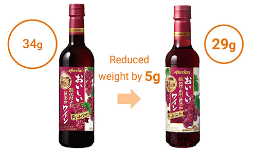For these products, Mercian uses bag-in-box containers, consist of outer paper boxes and inner flexible plastic bags. By reducing the weight of the outer box from 190g to 143g, by approximately 25%, we reduce the use of paper resources by around 31 tons per year.