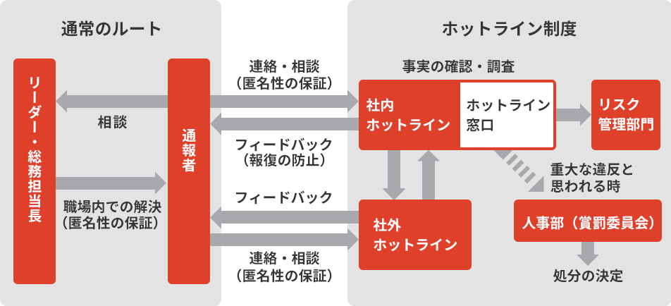 当社グループでは、企業活動に伴う重大な問題を未然に防ぐことを目的に、コンプライアンス違反・腐敗行為・人権問題(ハラスメント等も含む)等をはじめ、『コンプライアンス・ポリシー』/『コンプライアンス・ガイドライン』に違反する(またはその恐れのある)行為を対象とする内部通報窓口(『ホットライン』)を設置しています。