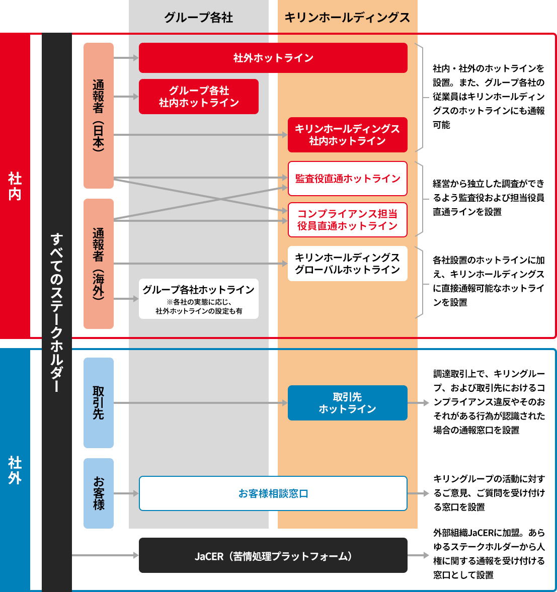 その他、キリンホールディングスおよび当社グループ各社の役員の関与が疑われる場合などに、独立性をもって調査等が進められるよう社内監査役直通のホットラインやコンプライアンス担当役員直通ホットラインも整備しています。