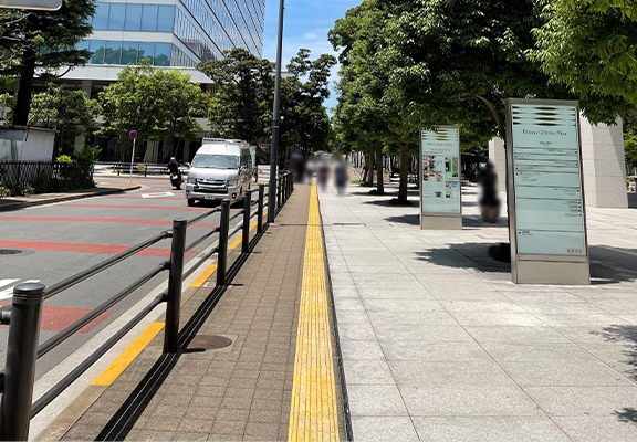 ビル入り口までの誘導ブロックは敷設されておりません 。また、植え込みなどがありますので、 歩行にはご注意ください。