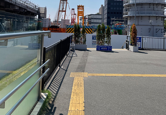 最後の警告ブロックまで進むと、右方向に続く誘導ブロックがありますので、約30m右方向へ進みます。