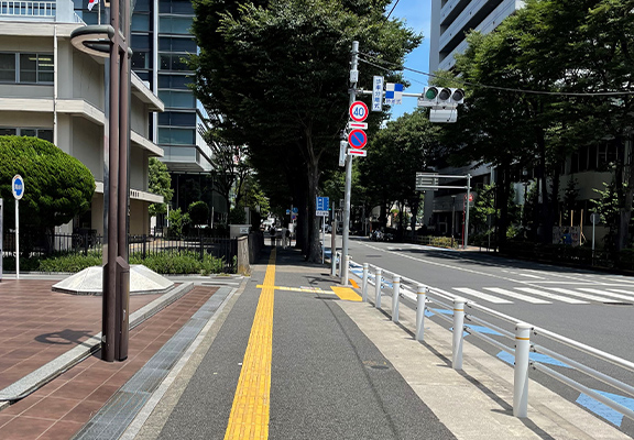 横断歩道を超えると、左方向へ進む誘導ブロックがありますので、約30m進みます。