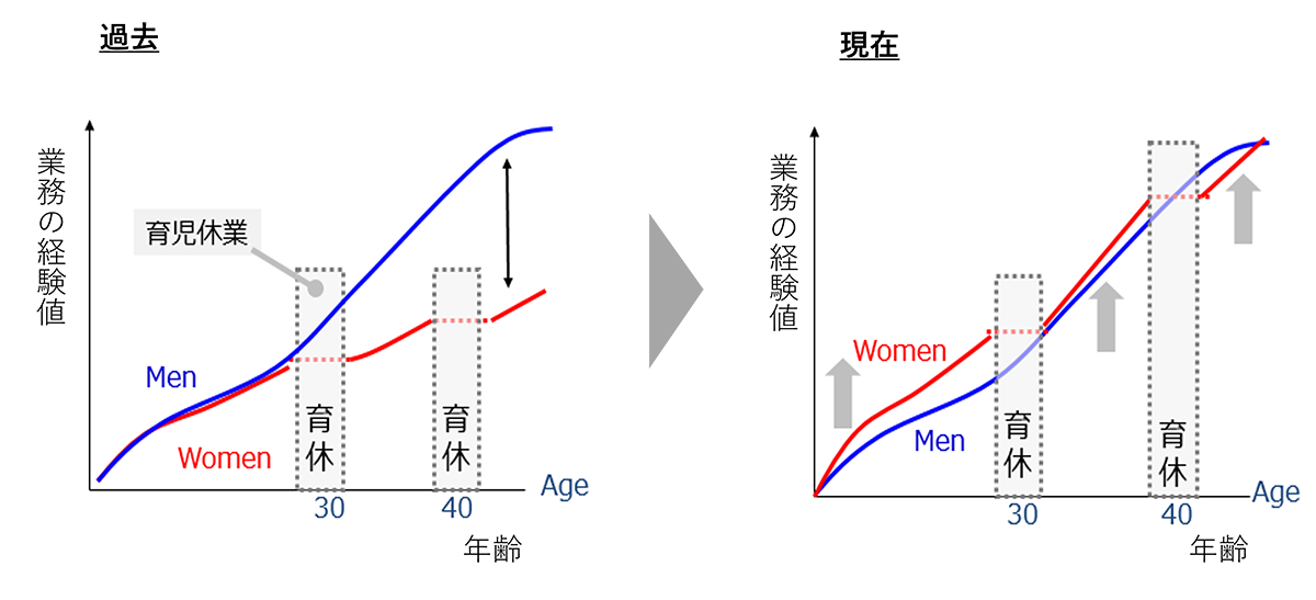 男女ともに早期にリーダーシップを発揮できる組織風土に向けて、出産・育児を迎える前に、早目に仕事経験や成功体験を積ませ、得意領域をつくる 「早回しのキャリア形成」を推進しています。