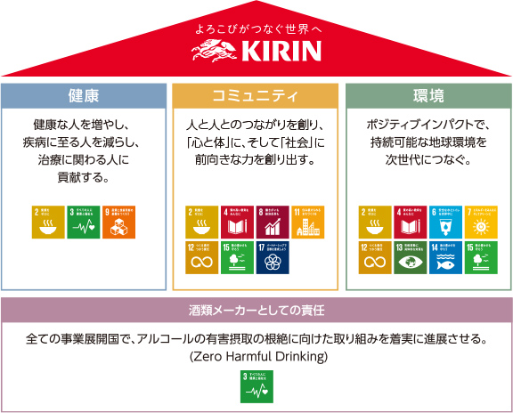 キリングループは、自然と人を見つめるものづくりで、「食と健康」の新たなよろこびを広げ、こころ豊かな社会の実現に貢献します。
