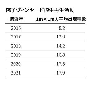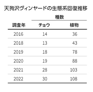 天狗沢ヴィンヤード生態系回復推移。2016年 植物36種 チョウ14種。2018年 植物43種 チョウ13種。2019年植物78種 チョウ18種。2020年植物88種 チョウ19種。2021年植物103種 チョウ28種。2022年植物108種 チョウ30種。
