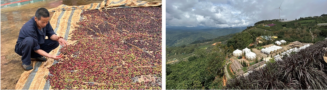 コーヒー果実(ロブスタ種)を乾燥させる 風光明媚なコーヒー豆生産地ダラット様子