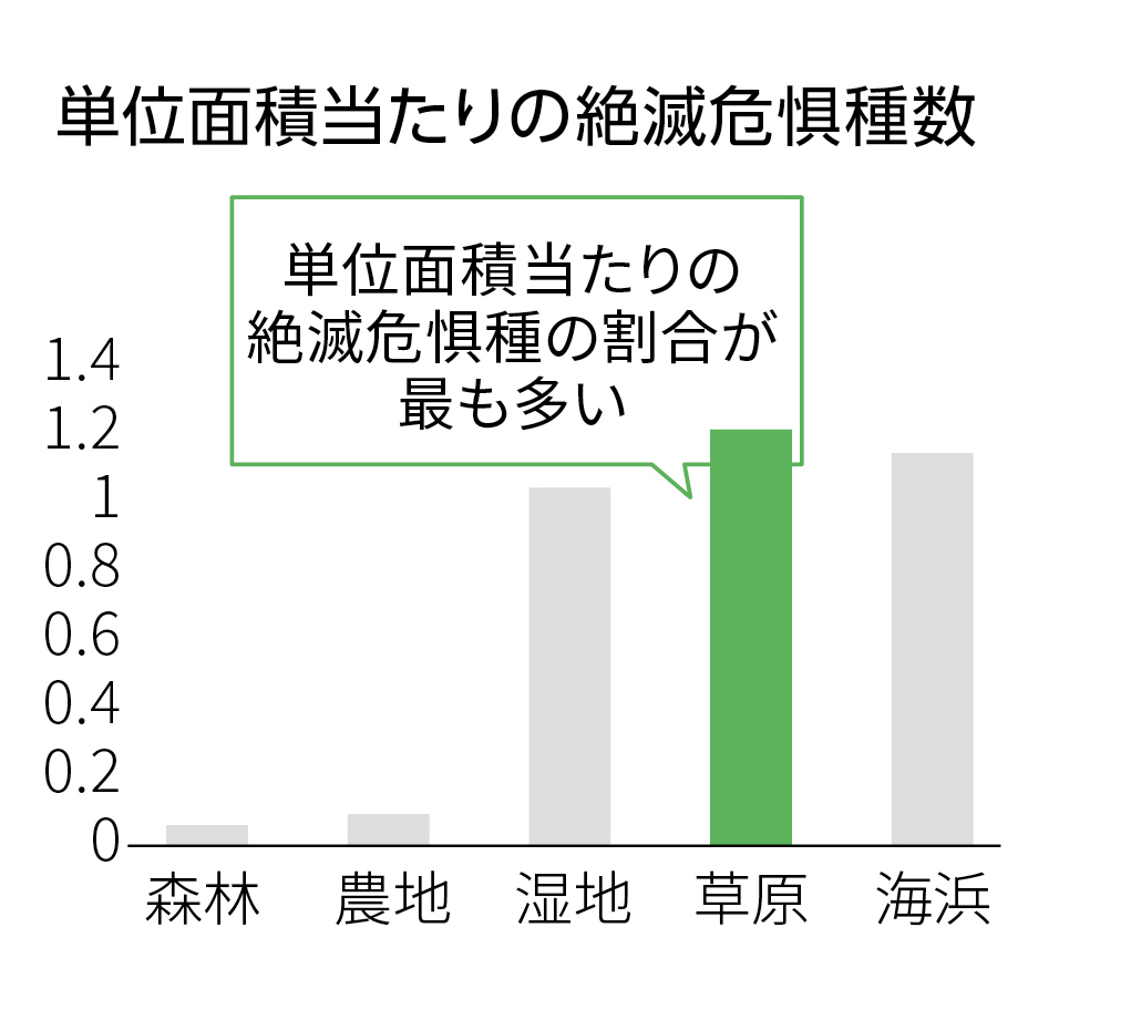 国立研究開発法人 農業・食品産業技術総合研究機構(以後、農研機構)の研究員を招き、長野県上田市丸子地区陣場台地にあるシャトー・メルシャン椀子ヴィンヤードで2014年から実施している生態系調査で、環境省のレッドデータブックに掲載されている絶滅危惧種を含む昆虫168種、植物289種を確認しています。山梨県甲州市勝沼の城の平ヴィンヤードでも、絶滅危惧種を含む多くの希少種が見つかっています。日本ワインのために遊休荒廃地を草生栽培のブドウ畑に転換することは、事業の拡大に寄与するとともに、現代の日本に貴重な草原を創出し、豊かな里地里山の環境を広げ、守ることにもつながっています。自然には、人の手がかけられていくからこそ守られていく“二次的自然”と呼ばれる形態があります。その代表例が草原です。日本ワインのためのブドウ畑は垣根仕立ての草生栽培のために定期的に下草刈りを行いますが、このことが畑を良質で広大な草原として機能させ、繁殖力の強い植物が優勢になることなく在来種や希少種も生育できる環境を作ります。椀子ヴィンヤードは、COP15で採択されたグローバル目標「2030年までに陸域の30%ならびに海域の30%を保護する」(30by30)の対象である「保護地域以外で生物多様性保全に資する地域(OECMs:Other Effective area-based Conservation Measures)」に位置づけられています。130年前には日本国土の約30%を占めていたという草原ですが、今は国土の1%にまで減少しています。草原は、単位面積あたりの絶滅危惧植物の割合が極めて高く(下図参照)、生物多様性を保全する上で貴重な役割を果たしています。2023年10月に民間や自治体などが所有している生物多様性の高い地域である“自然共生サイト”において、事業として農作物を栽培している場所としてはその時点で唯一環境省から認定を受けました。また2025年3月には、山梨県の城の平ヴィンヤードも、“自然共生サイト”として認定されました。