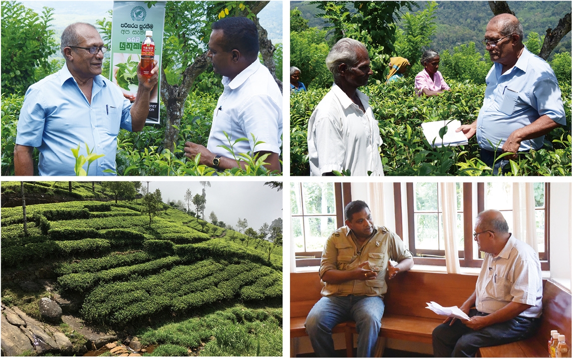 トレーナーのGiri氏と農園マネージャー(左上、右下)、小農園主(右上)、紅茶農園(左下)