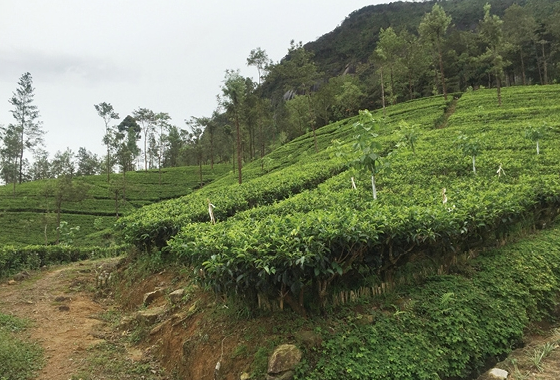 スリランカでは気候変動の影響を大きく受けて、干ばつと大雨が頻発しています。都市化や工業化、不適切な土地利用により土壌の侵食や流出も大きな問題となっています。紅茶農園は日当たりの良い急峻な斜面にあることが多いため、大雨が降ると肥沃な土壌が流出するだけではなく、地滑りが発生して農園に住んでいる人々の命が失われる例もでてきています。“地面を草で覆うこと(カバークロップ)”は生態系を豊かにするだけではなく、大雨で直接雨が地面に当たらないようにする土壌流出防止効果や渇水時の保水効果など、気候変動への適応策としても有効です。トレーニングでは茶の栽培に悪い影響のある草を見分ける方法を教え、茶園の地面が根の深い良い草で覆われるように指導します。トレーニングでは、農薬や肥料の使用量を抑えながら収量を上げる科学的な方法を指導することで、森林を守るだけではなく、農薬や肥料に対する支出削減により農園の収益も向上し、茶葉の安全性も高まります。