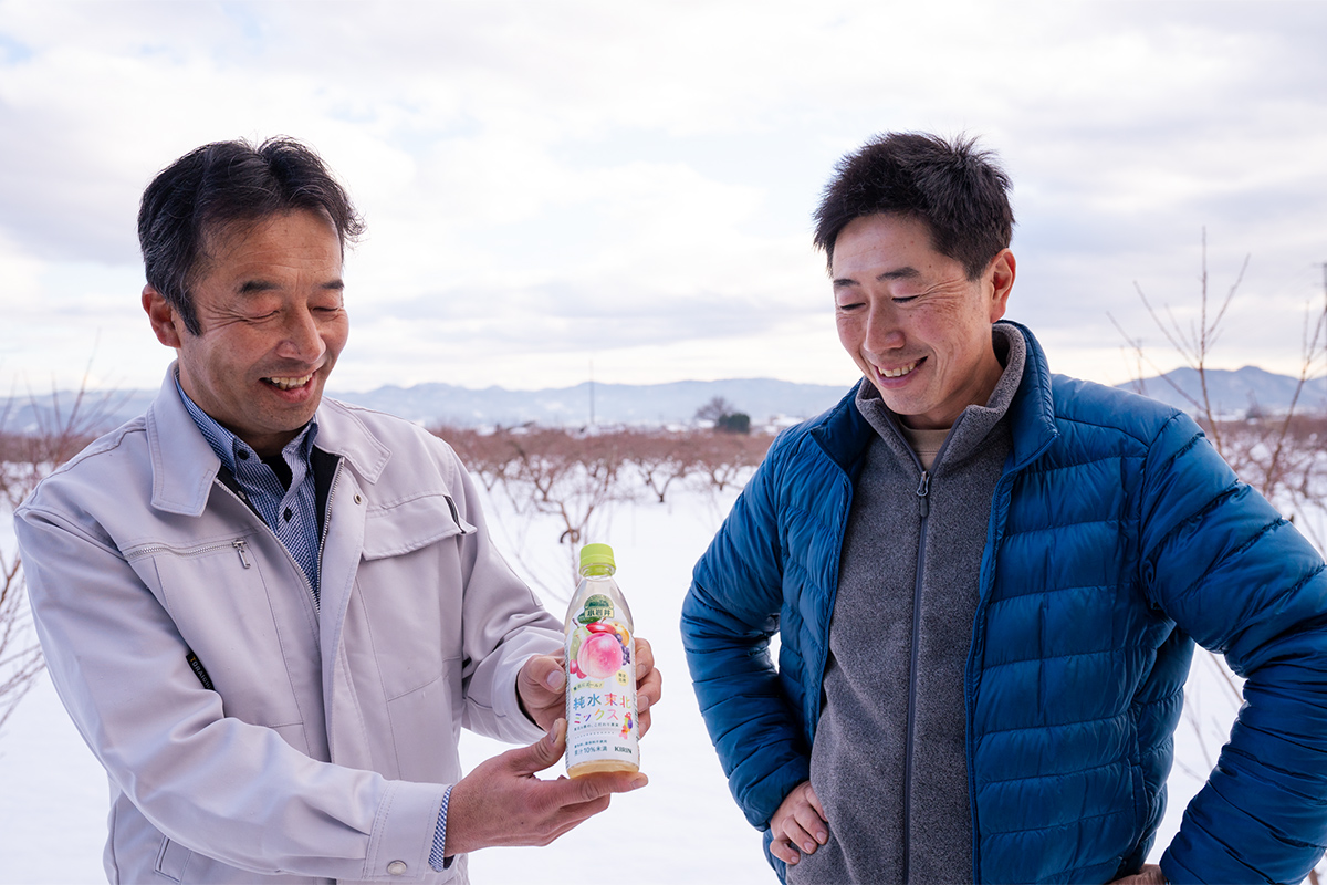 被災地の皆さんが各地で立ち上げたプロジェクトと手を携え、継続的な支援に取り組んできた「復興応援 キリン絆プロジェクト」。そのひとつが福島県の果樹農家による「“桃の力”プロジェクト」との取り組みです。そして、今年3月2日に発売になるのが『小岩井 純水東北ミックス』。東北6県の果物を使用したミックスフルーツ味の飲料※で、福島からは「キリン絆プロジェクト」でともに活動をした果樹農家の桃を使用していますが、農家のおふたりと飲料の開発を務めたキリンビバレッジの社員が、この10年に築いてきた「キリン絆プロジェクト」、さらにはそれぞれの絆に対する想いを語り合います。