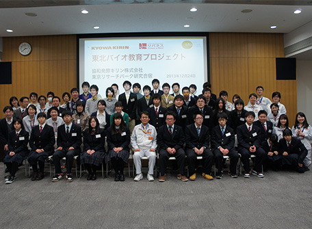 協和発酵キリンは、「東北バイオ教育プロジェクト」を通じて、岩手県、宮城県、福島県の高等学校・高等専門学校(計6校)を対象に研究支援プログラムを提供しました。 また、日本農芸化学会による東日本大震災で被災した岩手県、宮城県、福島県の中学校・高等学校(計71校)を対象にした理科教育支援をサポートすべく、2013年4月までに累計7000万円を寄付しました。