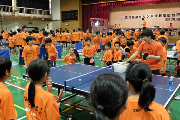 協和発酵キリンでは、2011年11月から2014年6月まで、岩手県・宮城県・福島県において卓球を通じた様々な支援を行いました。「子どもの笑顔づくり支援 卓球教室」では、実業団トップクラスの当社卓球部の選手と直接ふれあう場を提供することで、子どもたちの夢と希望の創造に貢献すると共に、豊かな心の成長を支援しました。また、地域住民の方を対象の卓球交流会や障がい者の方を対象とした卓球交流会も開催し、誰もが楽しめる卓球を通じて被災地の皆様の笑顔の輪を広げる活動を展開しました。卓球台等の寄贈も行いました。