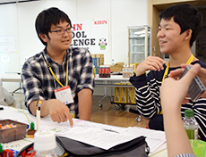 午後になって、まずは感じたことをレゴで表現してみました。更にチームの中で各メンバーの想いをつなぎあわせ1つのメッセージに仕上げます。