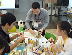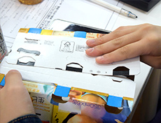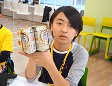今回は講義だけではなく、その中から容器包装の軽量化を実感いただくことを目的に、6缶パックの板紙を、一人ひとりに組み立ててもらいました。少し難しかったようですが、軽量化や軽量化したまま強度を保つためのたくさんの工夫を自分たちの手で感じることができたようです。
