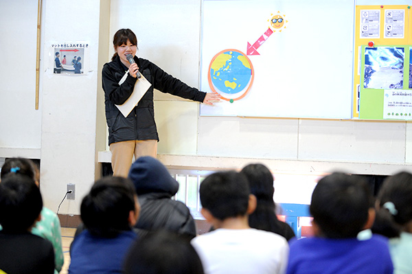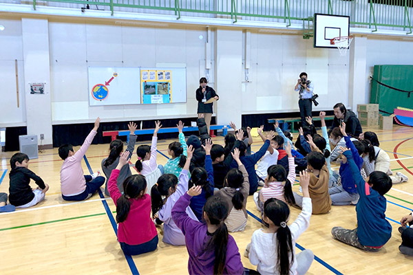 体もほぐれたところで、代表的な3つのマークを先生が説明します。ただ説明するだけではなくクイズを交えたことで、子どもたちは興味をもって参加することが出来ていました。