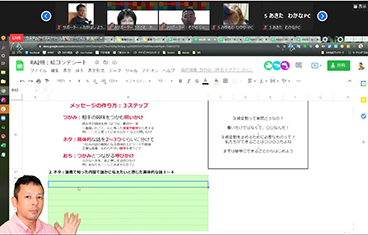 まずは、ZOOMのブレイクアウトルームで各チームに分かれて、Google スプレッドシートを使いながら講義を聞いて関心を持ったところ、伝えたい内容を共有し、何を伝えたいかを議論しながら決めていきます。