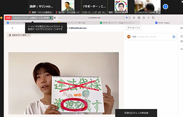 ワークショップ後半では、まず参加者全員で学生一人一人が撮影した動画を再生しながら、スケッチブック・ストーリーとして成り立たせるためのテクニカルな部分を確認します。その後は、各チームでZOOMのブレイウトルームに分かれます。各チームでは、各自で撮影した動画を1つのスケッチブック・ストーリーとしてつないでみた中で、訴えかけたいことがうまく伝わる動画になっているかを確認し、改善点を見つけていきます。