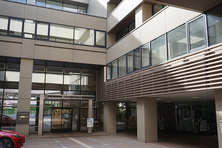(聖心女子大学4号館の入り口にある田窪恭治さんの作品「黄金の林檎」の前で撮影したFSCチーム参加者の皆さん)