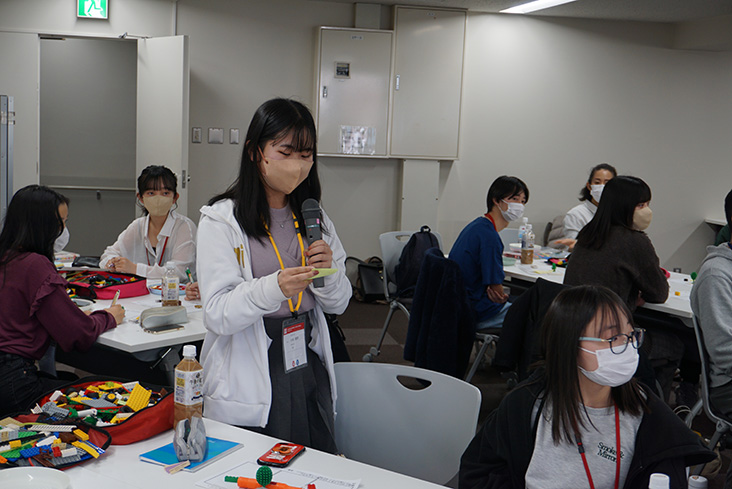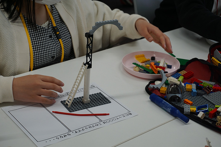 まずは、3分程度での「登ってみたいと思うタワー」の製作。その後に、持ち時間1分程度で「なぜ、そのタワーを作ったのか」を説明し、残り1分でチームメンバーから、「なぜその高さなのか?」「なぜ、そのレゴの色を使ったか?」などの質問を受けます。