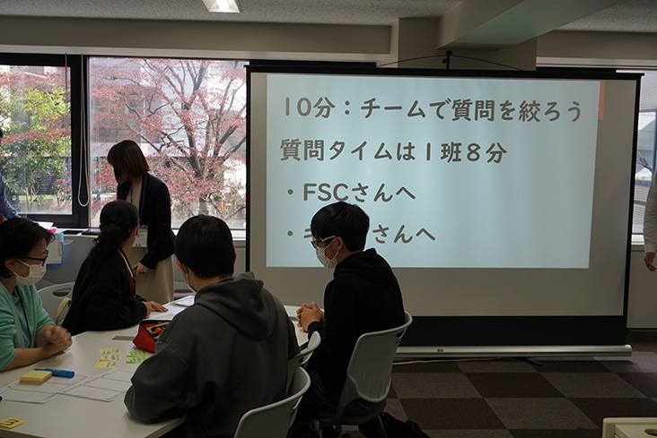 チーム毎に、動画を見て生じた疑問を共有して話し合い、1つか2つ質問したいことを決め、FSCやキリンの担当者に質問します。認証が必要な背景などの質問に加えて、「キリンの社員の一日のスケジュールを教えてください」という素朴な質問もあり盛り上がりました。