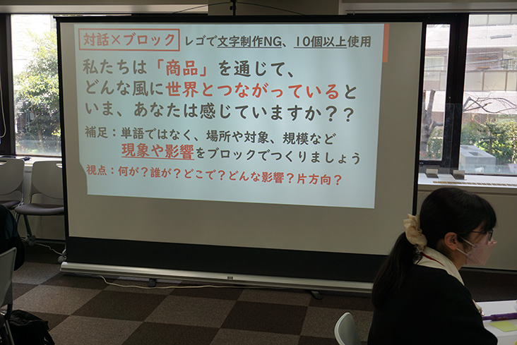 まず、導入部としてTシャツを例として、社会の課題と解決するために必要な考え方について学びます。