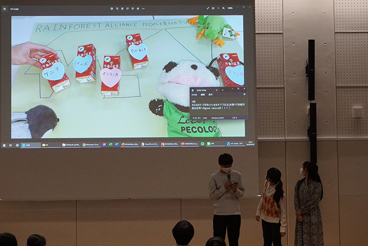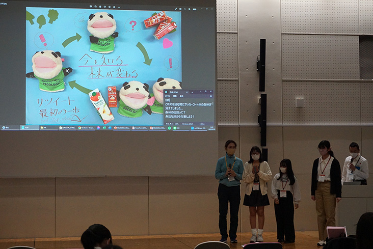 参加した中高生の作品は「こども国連環境会議推進協会」のツイッター・アカウントで発信し、2023年4月10日(月)~5月21日24:00(日)の間、「FSC」「レインフォレスト・アライアンス」の各回で、最も多くの各リツイート数を獲得したチームが優勝です。1年を通じてテーマ毎の優勝チームを決めて、来年の冬または春休みに表彰式を行い、表彰状とエコパンダのパペットを進呈することになっています。