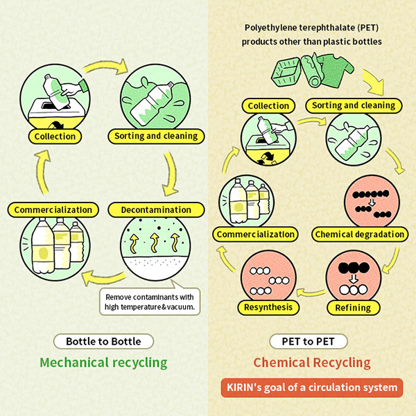 Horizontal recycling is known as mechanical recycling, but Kirin is also working on the practical application of chemical recycling, which breaks down and recycles at the molecular level.