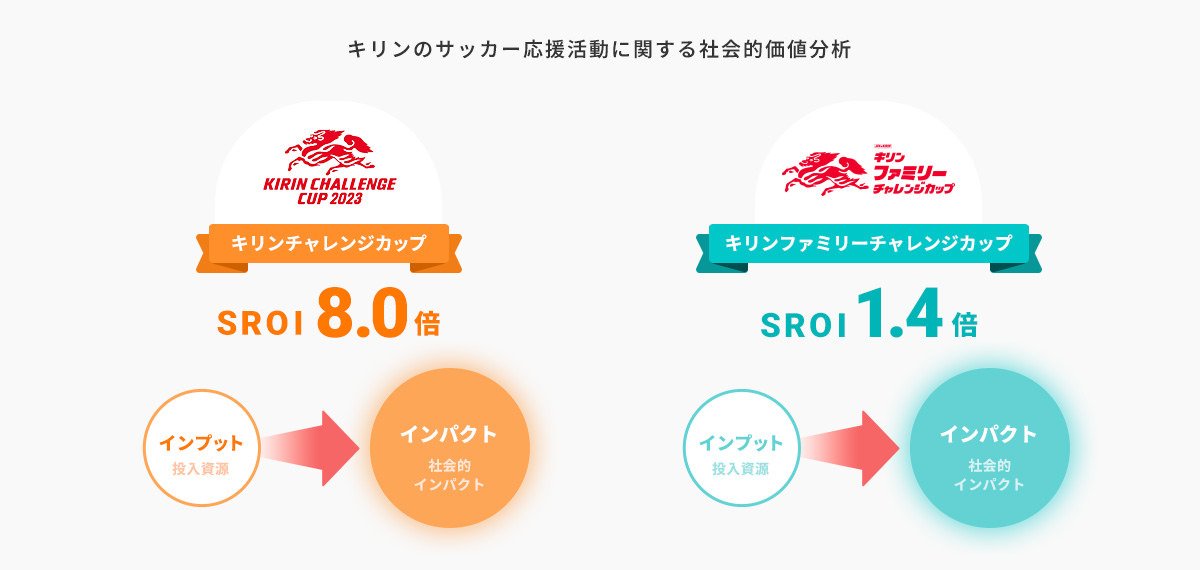 Kirín Challenge Cup: Through supporting the Japanese national soccer team, we quantified the impact on a wide range of people, focusing on "energy for tomorrow," "expansion of community circles," and "deepening of bonds," which resulted in an SROI ratio of 8.0:1.