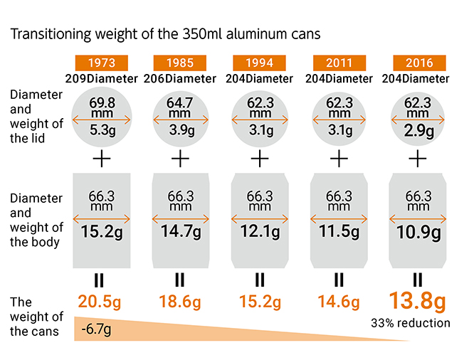 In 2011, we achieved a weight reduction of our aluminum cans approximately 29% with our 204 diameter can compared with the 209 diameter can which was standard at the time, by reducing the diameter of can lids, narrowing the top and bottom edges, thinning the walls. Working with materials manufacturers, we developed an aluminum can with thinner can lids and a body in 2016. We have reduced the overall weight of the can by approximately 5% (from 14.6g to 13.8g). This represents a weight reduction of 33% (6.7ɡ) from the 209 diameter can. Weight reduction is necessary for both steel and aluminum cans. In particular, aluminum requires a large amount of electricity for smelting, so weight reduction contributes significantly to the reduction of Scope 3 GHG emissions.