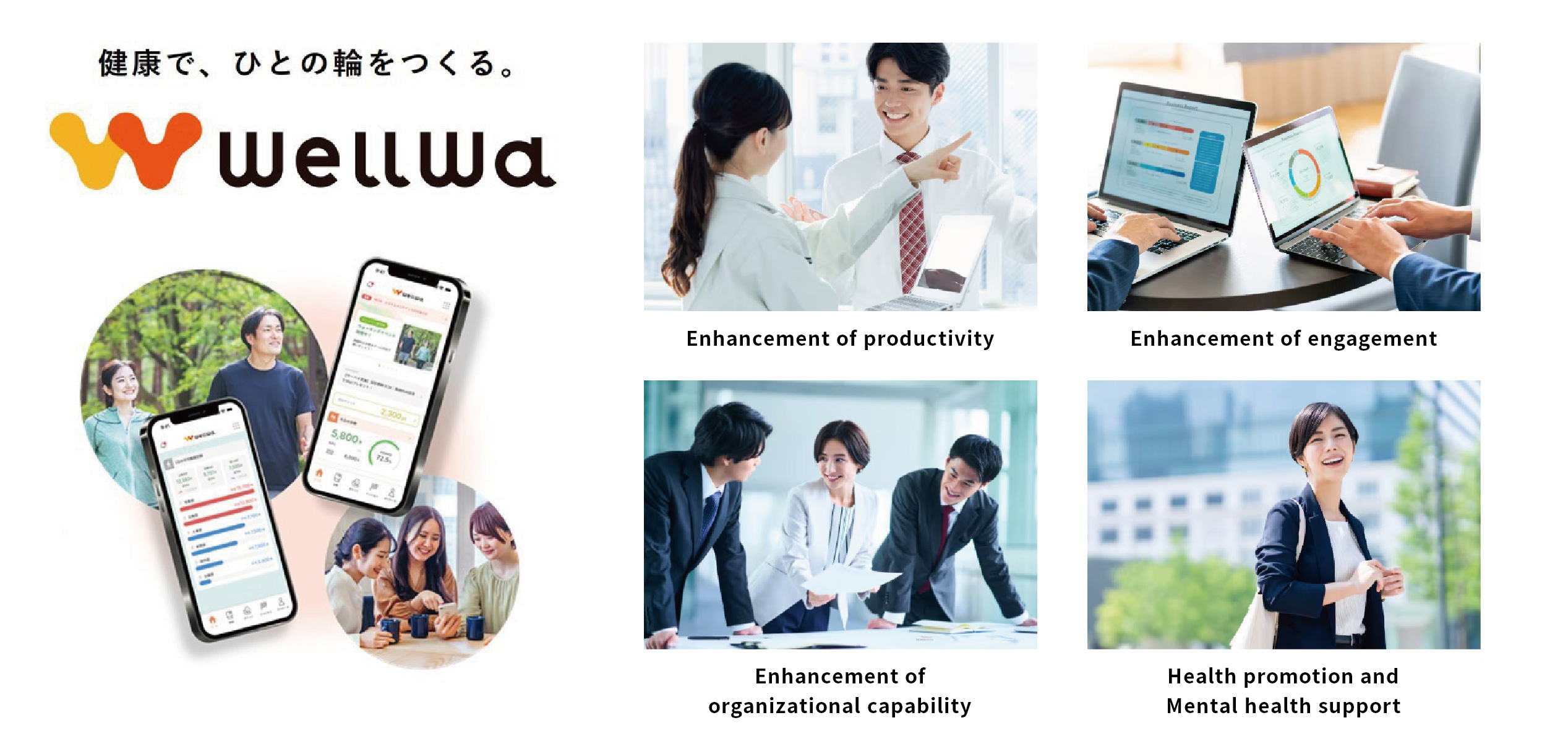 WellWa is a corporate service that supports the promotion of well-being for individuals and organizations. The WellWa app offers a variety of engaging features that can be enjoyed continuously, such as team-based health competitions and point redemption for beverages. In addition to the app, we provide various services including seminars to support employees' healthy habits and beverage and food placement services.