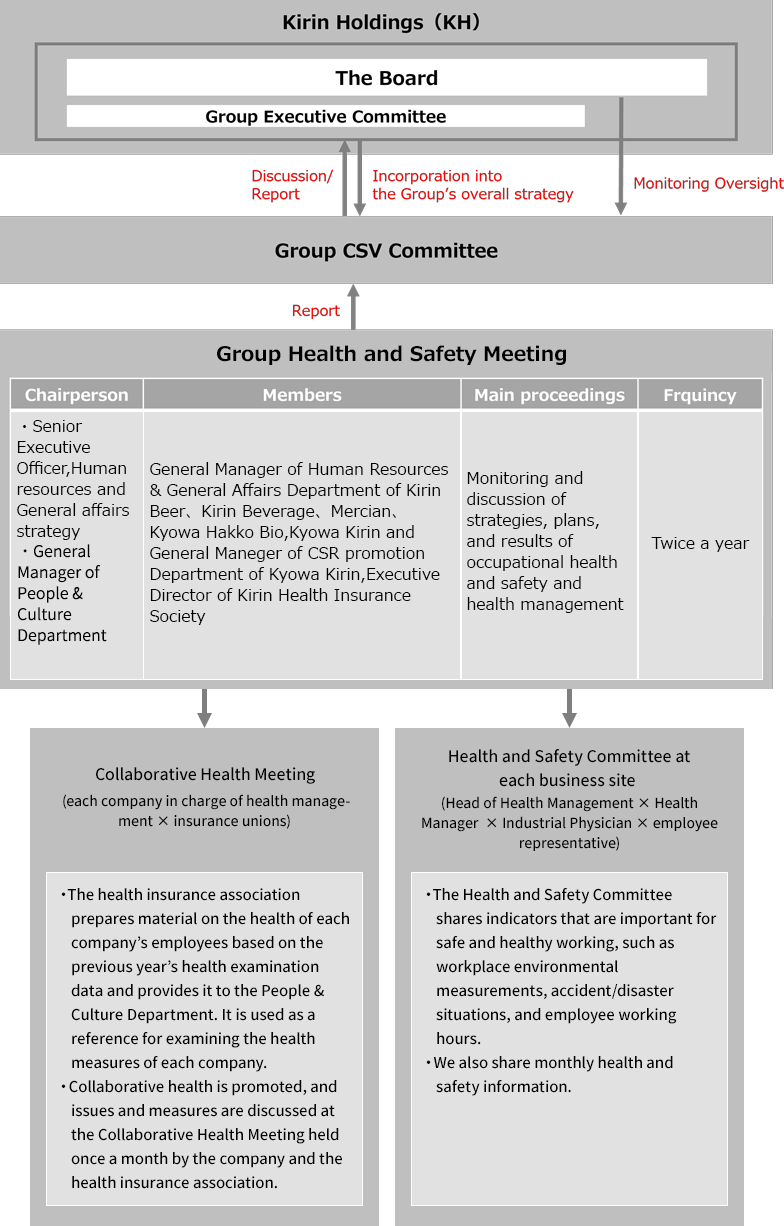 The Kirin Group towards Implementation of health and productivity management,Kirin Holdings has established a "Group Health and Safety Meeting" to monitor the progress of indicators and discuss policies, strategies, and plans related to health and safety. The contents of the meetings have been reported to the Group CSV Committee and, if necessary, to the Board meeting for deliberation and reporting.
