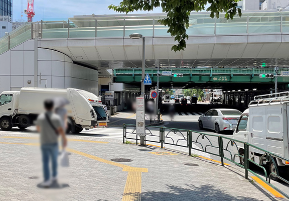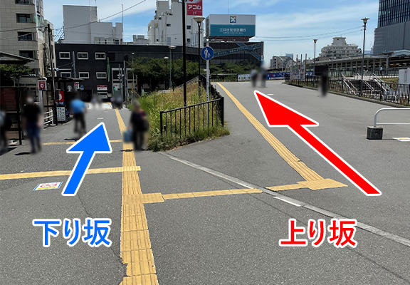 横断歩道を渡った先が下り坂となっていますので、お気をつけてお進みください。