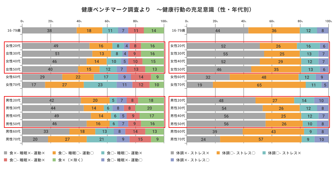 健康ベンチマーク調査より ~健康行動の充足意識(性・年代別)