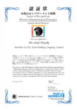 キリンホールディングスは、ジェンダー平等と女性のエンパワーメントを目指す国連機関UN Women (ユー・エヌ・ウィメン)と国連グローバル・コンパクトの協力によって策定されたガイドライン「女性のエンパワーメント原則~平等はビジネス向上のカギ~」に、2012年12月に署名しました。このガイドラインをきっかけに、外部からの視点も取り入れながら女性の活躍をさらに推進していきます。