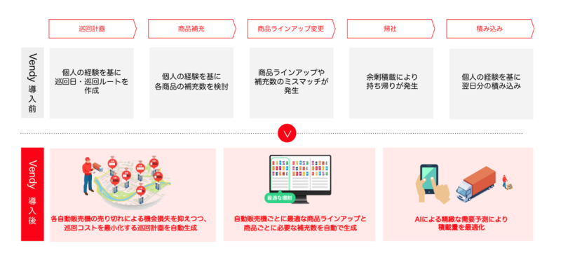 当社は、事前に実施した共同実証の結果を踏まえ、「Vendy」導入により、自動販売機オペレーションに関わる業務時間の約1割の削減と約5%の売上増を見込んでいます。また、売れ行きの良い商品アイテムの提案だけでなく、商品ブランド育成の観点も考慮した上での最適な商品ラインアップの提案が可能となっており、お客様ニーズの充足と商品ブランドの育成を両立させることが出来ます。「Vendy」導入により創出された時間は、自動販売機の新規設置先の開拓に充てることが出来、また、属人的な業務プロセス改善により、人材配置の柔軟性を高め、従業員の育成を促進することが可能となります。