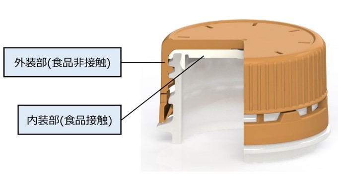 ※2:キャップには、1ピースキャップと2ピースキャップがあり、1ピースキャップは一体成型で構成されており、2ピースキャップは、ボトル天面と接触する内装部(食品接触)と外装部(食品非接触)から構成される。