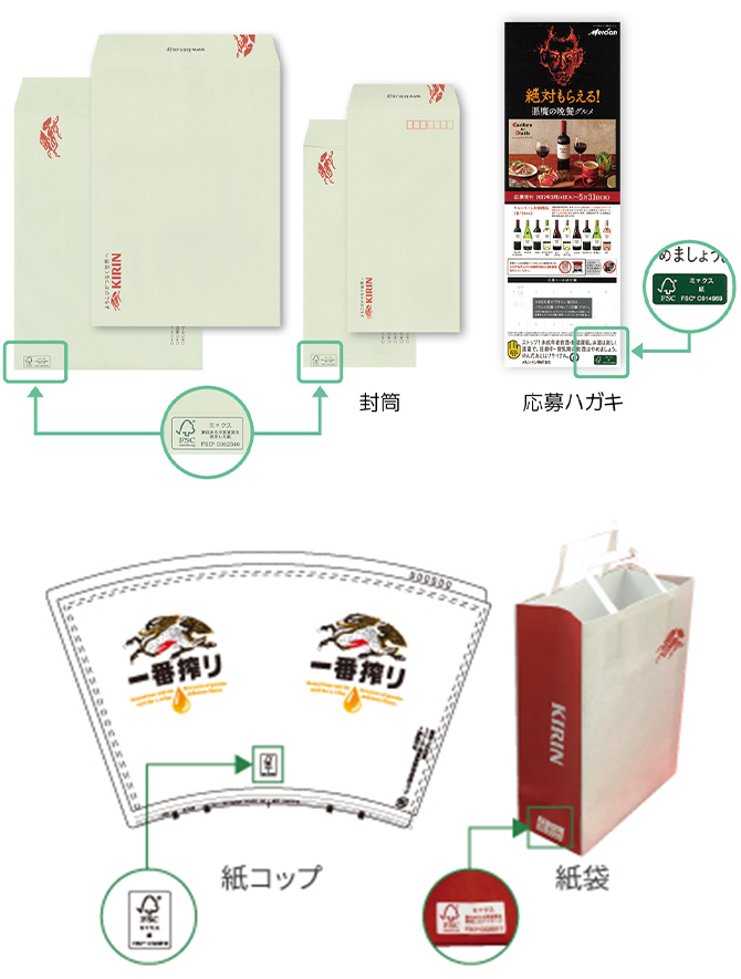 現在では、KIRINのロゴの付いた紙袋や懸賞用の応募ハガキ、試飲用の紙コップの一部についてもFSC認証紙の採用を進めています。