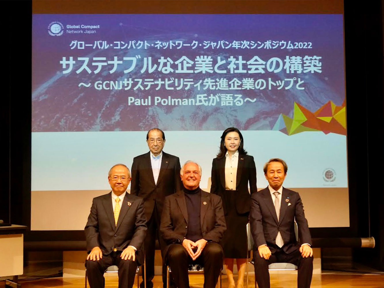 当日の登壇者:上段左から有馬利男氏(GCNJ代表理事)、呉文繍氏(GCNJ理事/国際航業 代表取締役会長/UNGCボードメンバー)、下段左から磯崎、Paul Polman氏、山名昌衛氏(コニカミノルタ 取締役 執行役会長)