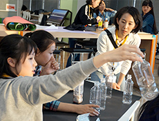 今回は講義だけではなく、その中から容器包装の軽量化を実感いただくことを目的に、6缶パックの板紙を、一人ひとりに組み立ててもらいました。少し難しかったようですが、軽量化や軽量化したまま強度を保つためのたくさんの工夫を自分たちの手で感じることができたようです。