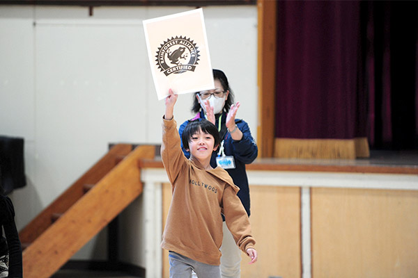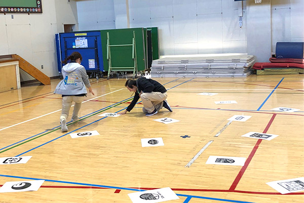 体もほぐれたところで、代表的な3つのマークを先生が説明します。ただ説明するだけではなくクイズを交えたことで、子どもたちは興味をもって参加することが出来ていました。