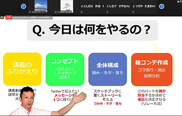 ワークショップ後半では、まず参加者全員で学生一人一人が撮影した動画を再生しながら、スケッチブック・ストーリーとして成り立たせるためのテクニカルな部分を確認します。その後は、各チームでZOOMのブレイウトルームに分かれます。各チームでは、各自で撮影した動画を1つのスケッチブック・ストーリーとしてつないでみた中で、訴えかけたいことがうまく伝わる動画になっているかを確認し、改善点を見つけていきます。