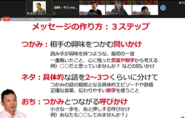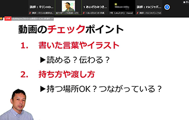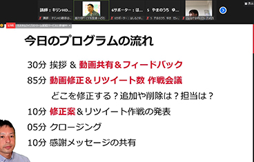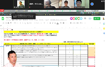 FSCジャパンとキリンの講師2名は、順に各チームのブレイアウウトルームを訪問し、撮影してきた動画に対してサジェスションを行います。各チームは、そのサジェスションを参考にして、さらに完成度を高めた動画にするための、各人の作業の進め方ついて話し合いを行っていきます。